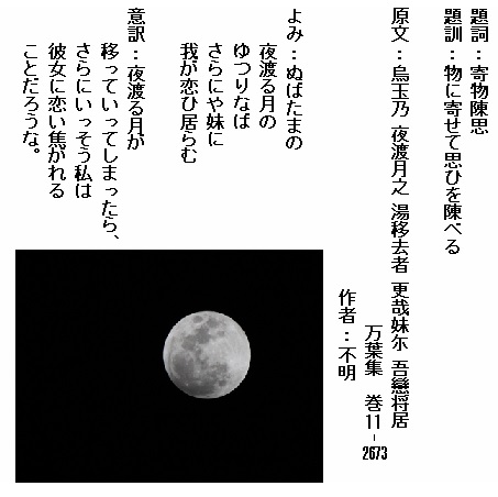巻11-2673:ぬばたまの夜渡る月のゆつりなばさらにや妹に我が恋ひ居らむ