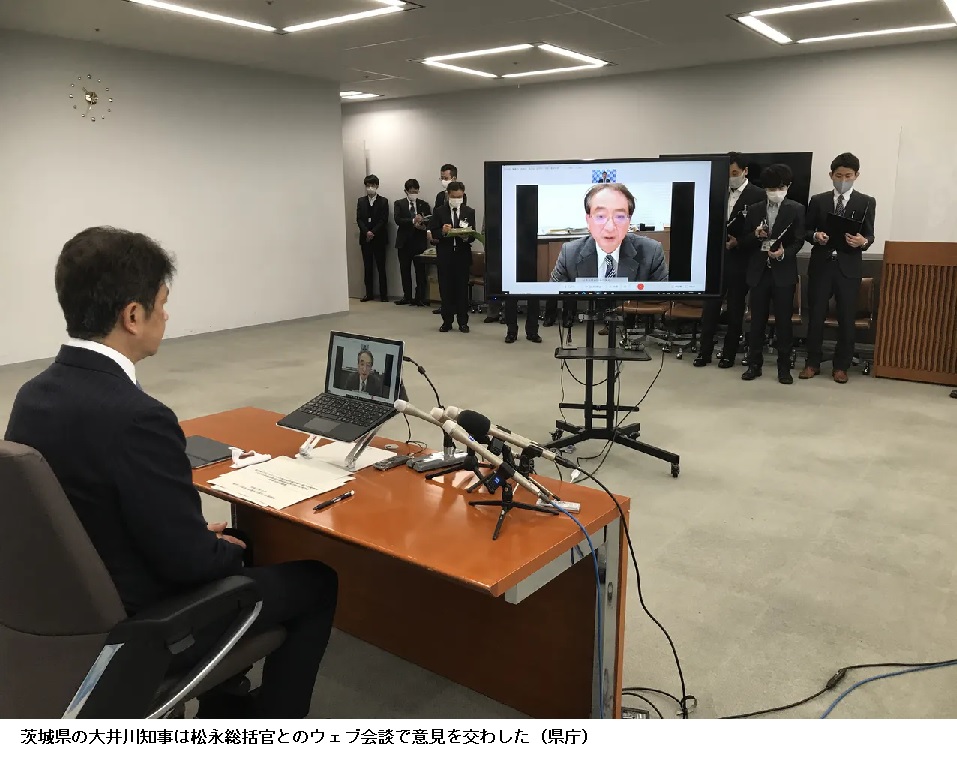 茨城知事、処理水放出「決定受け止め」 風評対策を要望 ―― 東京電力福島第1原子力発電所の処理水の海洋放出方針が決まったのを受け、茨城県の大井川和彦知事は内閣府の松永明・福島原子力事故処理調整総括官とウェブ会談した。知事は「決定は受け止める」とした上で風評被害対策に加え、被害が起きた際の賠償対象に茨城を含めるよう求めるとした。地元の漁業団体は反対の立場を崩していない。