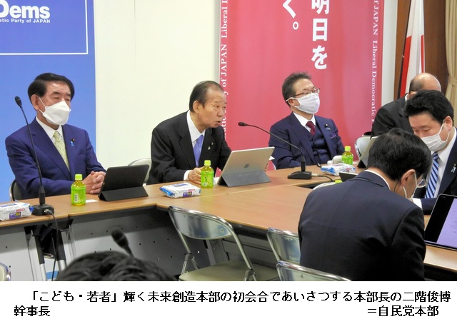 初会合で二階氏は「全ての子どもの未来に責任をもつのが我々自民党だという覚悟をもってこの問題に取り組んでいきたい」とあいさつした。その後、関係府省から子どもをめぐる現状の課題について説明を受けた。