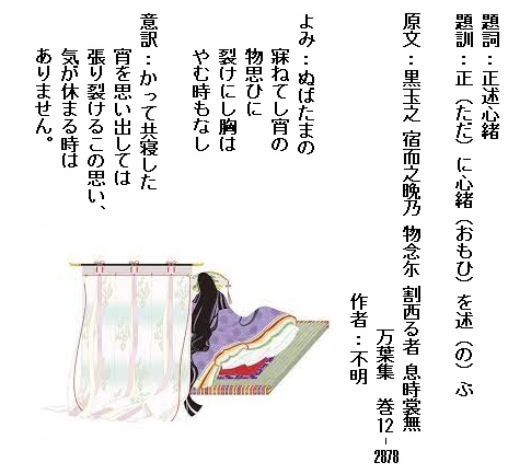 巻12-2878:ぬばたまの寐ねてし宵の物思ひに裂けにし胸はやむ時もなし