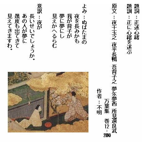 巻12-2890:ぬばたまの夜を長みかも我が背子が夢に夢にし見えかへるらむ