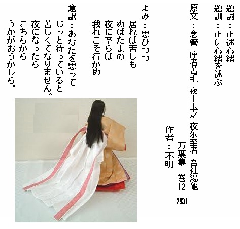 巻12-2931:思ひつつ居れば苦しもぬばたまの夜に至らば我れこそ行かめ