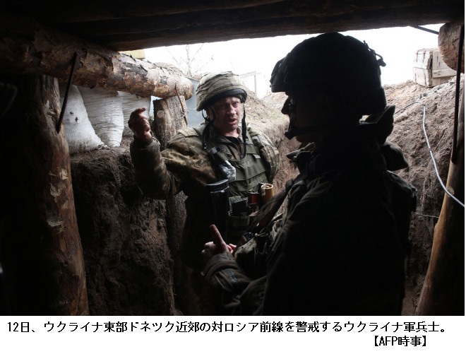 緊張の高まりを受け、ウクライナ東部では政府軍と親ロシア派武装勢力の戦闘が激化。12日もウクライナ軍兵士の死亡が発表された。ロシアはウクライナ支援の方針を明確にしているバイデン米政権をけん制するため、部隊増強の動きを続けているとみられる。米国の後ろ盾を得て強気の姿勢を示すウクライナのゼレンスキー政権を抑え込む狙いもありそうだ。