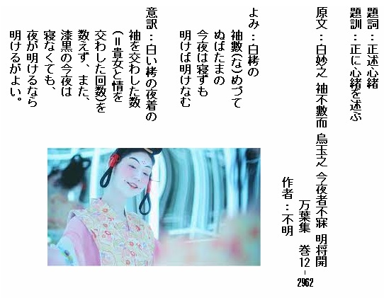 巻12-2962:白栲の袖離れて寝るぬばたまの今夜は早も明けば明けなむ