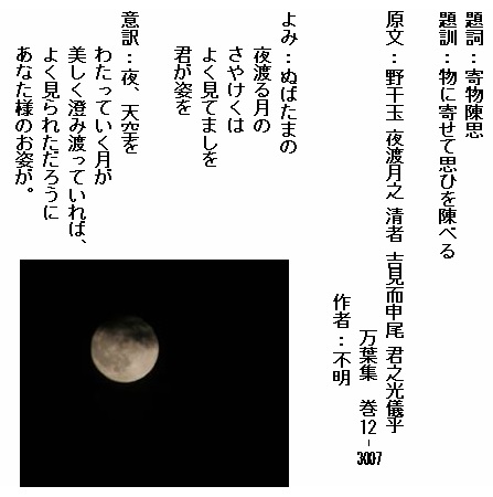 巻12-3007:ぬばたまの夜渡る月のさやけくはよく見てましを君が姿を