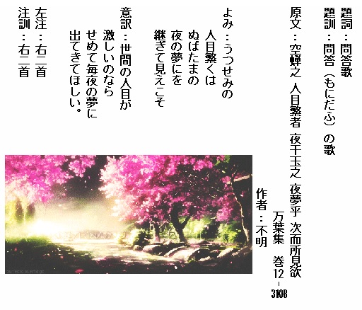 巻12-3108:うつせみの人目繁くはぬばたまの夜の夢にを継ぎて見えこそ