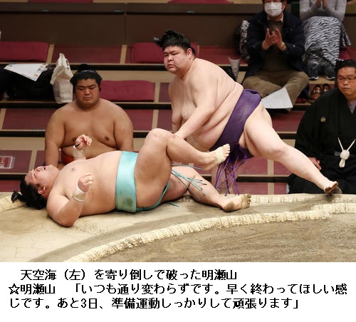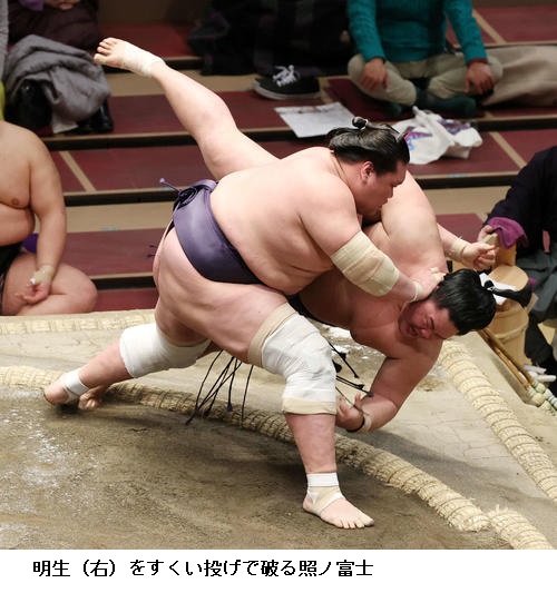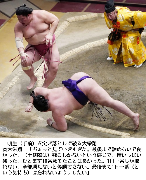 ▼大栄翔に明生は大栄翔が物言いがつく際どい相撲を突き落としで制して2敗を守りました。