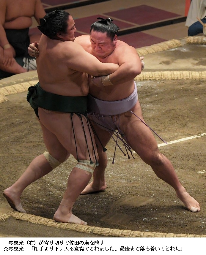 ▼琴恵光に佐田の海は琴恵光が寄り切り。