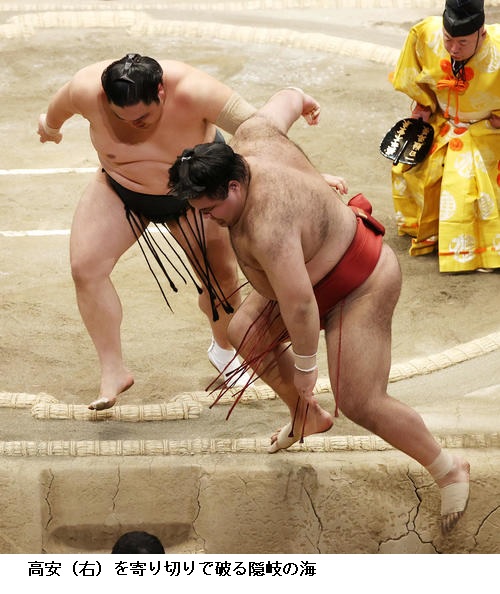 ▼隠岐の海に小結 高安は隠岐の海が寄り切り。
