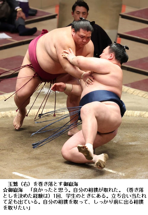 ▼小結 御嶽海に玉鷲は御嶽海が巻き落としで勝ちました。