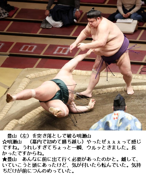 ▽豊山に明瀬山は明瀬山が突き落としで勝ち越しました。