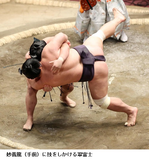 ▽新入幕の翠富士に妙義龍は翠富士がすくい投げで勝ち越しました。