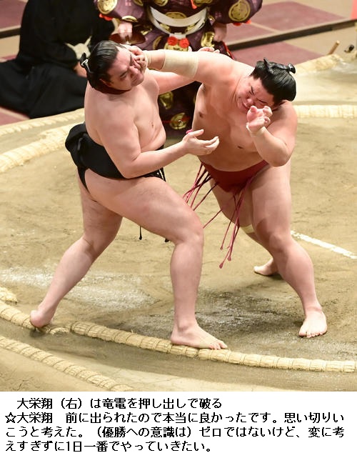 ▽竜電に大栄翔は大栄翔が押し出しで2敗を守りました。