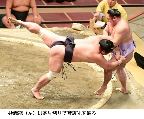 ▽妙義龍に琴恵光は、妙義龍が寄り切り。琴恵光は負け越しました。