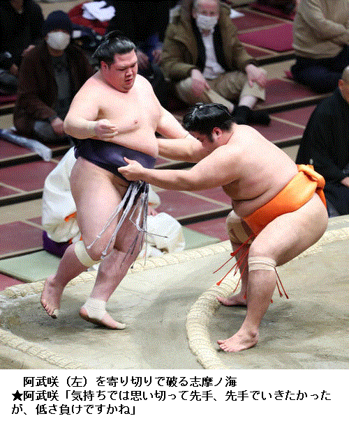 ▽阿武咲に志摩ノ海は、志摩ノ海が寄り切りで勝ち越し。