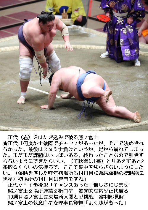 ▽大関 正代に関脇 照ノ富士は、照ノ富士がはたき込みで勝って10勝目を挙げました。正代は3敗に後退です。