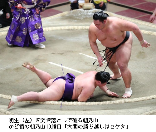 ▽明生に大関 朝乃山は、朝乃山が突き落としで勝ちました。