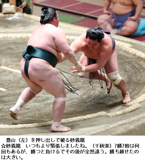 ▽豊山に妙義龍は妙義龍が押し出しで勝ち越し。豊山は負け越しました。