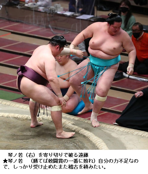 ▽遠藤に琴ノ若は遠藤が寄り切りで勝ちました。