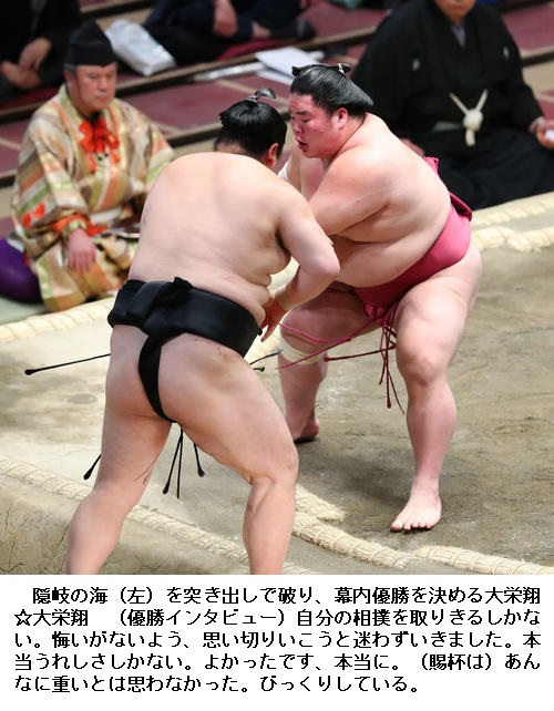 ▽隠岐の海に大栄翔は大栄翔が突き出しで勝って、13勝2敗で初優勝を果たしました。大栄翔は殊勲賞と技能賞も受賞です。