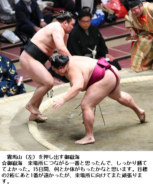 ▽朝乃山は10勝目。「ダメな相撲内容で反省していかないといけない。突き落としは体が自然に動いた。あすは最後なので来場所につなげられるように自分の相撲を取り切りたい。大関の勝ち越しはふた桁以上だと思うので、あすも自分の相撲を取りたい」と意気込んでいました。 (NHK WEB NEWS 2021年1月23日 22時38分)