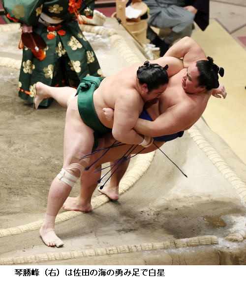 ▽琴勝峰に佐田の海は佐田の海に勇み足があって琴勝峰が勝ちました。