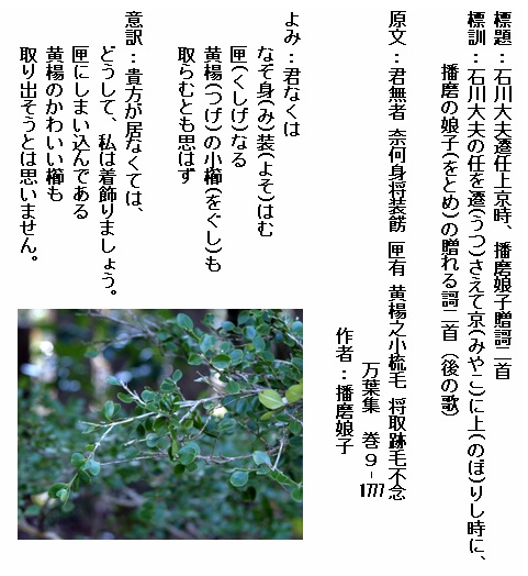 万葉集では、黄楊(つげ)そのものを詠んだ歌はなく、黄楊(つげ)の櫛(くし)、黄楊枕(つげまくら)などとして詠まれています。