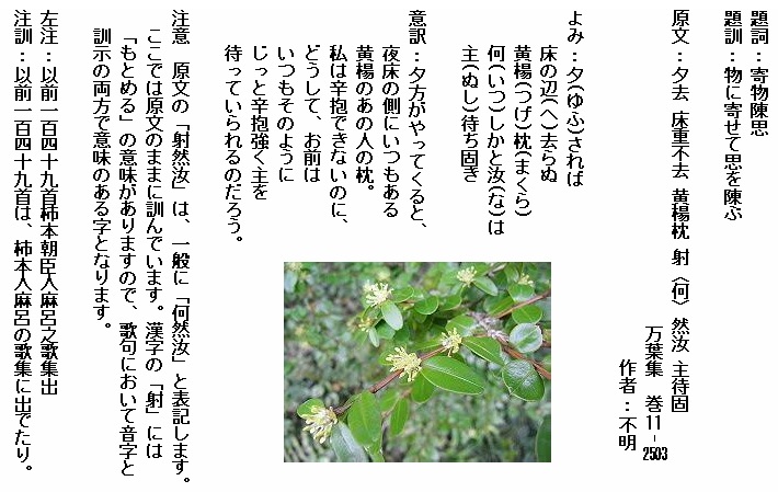 巻11-2503: 夕されば床の辺去らぬ黄楊枕何しか汝れが主待ちかたき