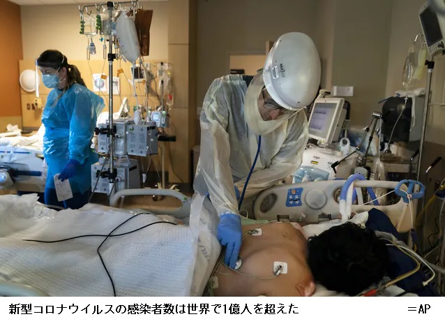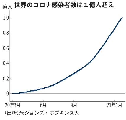 世界の新型コロナ感染者、1億人超え 変異種拡大に警戒 ―― 【ニューヨーク】世界の新型コロナウイルスの感染者数が26日、1億人の大台を超えた。わずか3カ月弱で2倍に膨らんでおり、世界人口(約77億人)の77人に1人が感染したことになる。欧米などでは気温の低下により感染が増えていることに加え、感染力の強い変異種の急拡大も感染拡大に拍車をかけている。