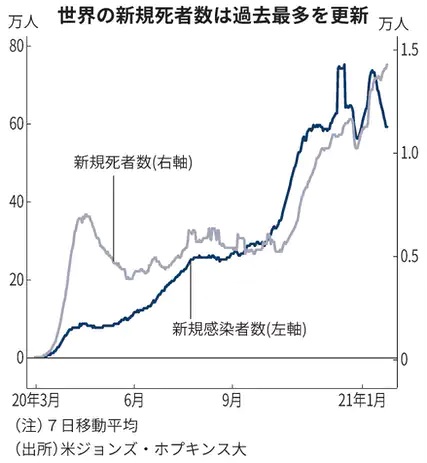 一方、新規死者数の増加ペースは加速している。1日あたりの新規死者数(7日移動平均)は25日時点で1万4200人超となり、過去最多を記録。死者数では米国が42万人超で首位、ブラジルが21万人超、インドが15万人超と続いた。