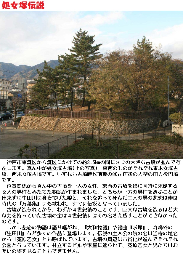 菟原処女(うないおとめ)という可憐な娘がいて、多くの若者から思いを寄せられていた。中でも同じ里の菟原壮士(うないおとこ)と、和泉国から来た茅渟壮士(ちぬおとこ)という二人の立派な男性が彼女を深く愛し、妻に迎えたいと激しく争うようになりました。娘はこれを嘆き悲しみ、「卑しい私のために立派な男たちが争うのを見ると、生きていても結婚などできましょうか、黄泉で待ちます」と母に語ると自ら命を絶ってしまいました。茅渟壮士はその夜、彼女を夢に見て彼女が愛していたのは自分だと知り、後を追います。菟原壮士も負けるものかと小太刀をとって後を追ったのです。その後、親族たちは集まって、このことを長く語り継ごうと、娘の墓を中央に男の墓を両側に作ったといいます。