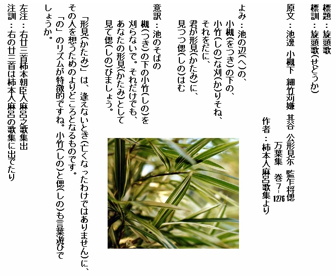巻7-1276:池の辺の小槻の下の小竹な刈りそねそれをだに君が形見に見つつ偲はむ