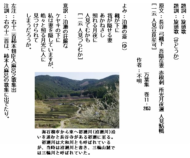 巻11-2353:泊瀬の斎槻が下に我が隠せる妻あかねさし照れる月夜に人見てむかも