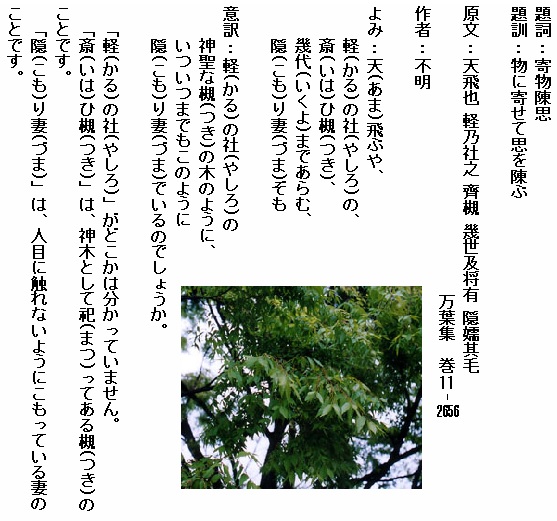 巻11-2656: 天飛ぶや軽の社の斎ひ槻幾代まであらむ隠り妻ぞも