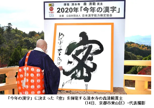 今年の漢字は「密」、新型コロナ感染拡大で ―― 2020年の世相を1字で表す「今年の漢字」に「密」が決まり、日本漢字能力検定協会が14日、京都市東山区の清水寺で発表した。新型コロナウイルスの感染拡大を受け、多くの人が「密」を意識し、日常生活にも大きな影響があったことなどが理由。