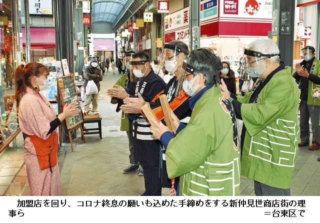 羽子板市へ景気づけの手締め 浅草寺境内で17〜19日 ―― 台東区の浅草寺境内で開かれる年末の風物詩「羽子板市」(17〜19日)をPRしようと、地元の新仲見世商店街の理事らが7日、約100の加盟店を回って商売繁盛の手締めをする恒例行事「羽子板ストリート」を催した。鳶(とび)の頭(かしら)の口上では、「コロナに打ち勝つことを祈念して」の言葉も加え、一本締めに疫病退散の意味も込めた。
