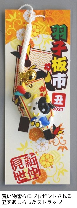 商店街では羽子板市に向けて、買い物客らにプレゼントするオリジナル羽子板ストラップ三千六百個、カレンダー四千部を用意した。ストラップは来年のえとの丑(うし)があしらわれている。