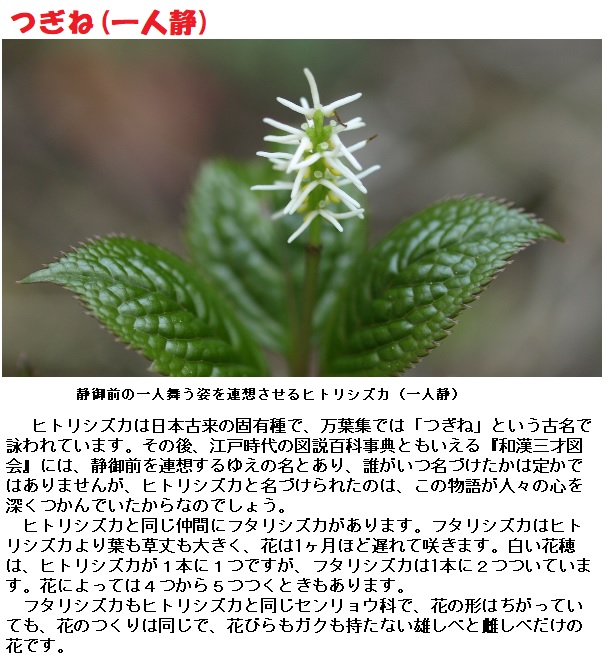 つぎねはセンリョウ科センリョウ属の一人静(ひとりしずか)、または二人静(ふたりしずか)という説があります。ここでは一人静(ひとりしずか)を紹介します。一人静(ひとりしずか)は、4~5月頃に山地や草地で、短い白い