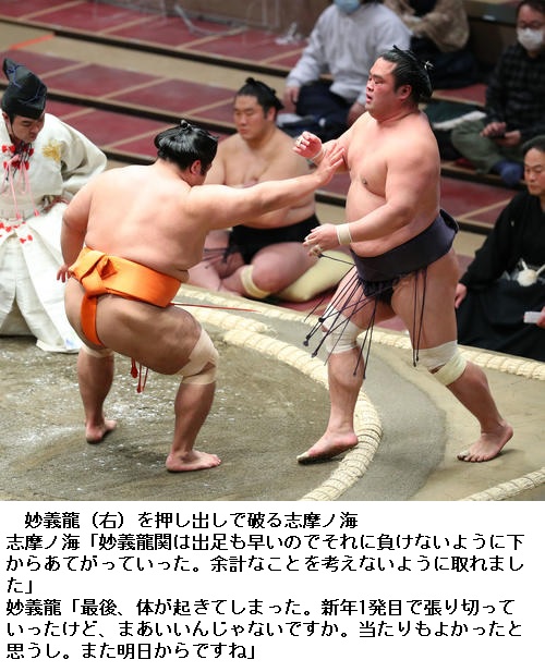 ▽志摩ノ海に妙義龍は、志摩ノ海が押し出しで勝ちました。