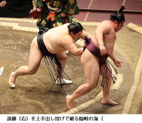 ▽遠藤に隠岐の海は、隠岐の海が上手出し投げ。