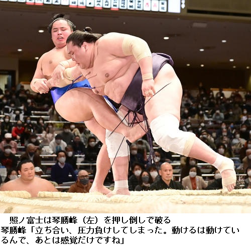 ▽関脇に復帰した照ノ富士に琴勝峰は、照ノ富士が押し倒し。