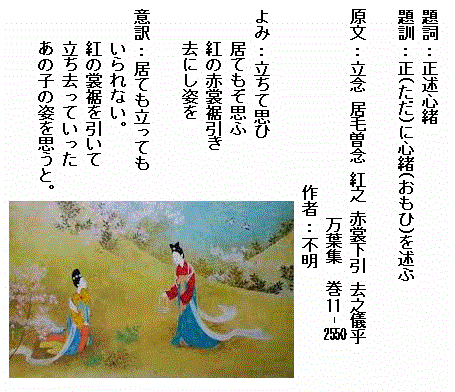 巻11-2550: 立ちて思ひ居てもぞ思ふ紅の赤裳裾引き去にし姿を
