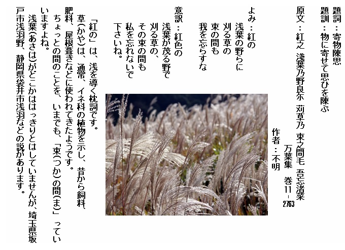 巻11-2763: 紅の浅葉の野らに刈る草の束の間も我を忘らすな