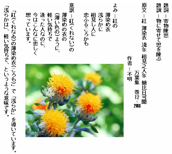 巻12-2966: 紅の薄染め衣浅らかに相見し人に恋ふるころかも
