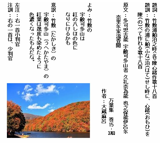 巻15-3703: 竹敷の宇敝可多山は紅の八しほの色になりにけるかも