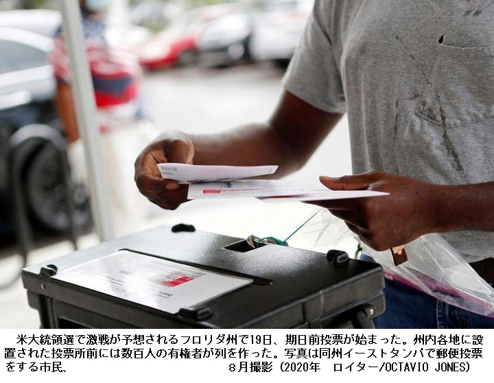 アメリカ大統領選、激戦州フロリダで期日前投票開始 支持率ほぼ拮抗 ―― 米大統領選で激戦が予想されるフロリダ州で19日、期日前投票が始まった。州内各地に設置された投票所前には数百人の有権者が列を作った。