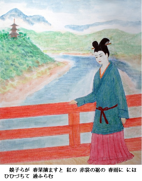 原文:荒玉能 年徃更 春去者 花耳尓保布 安之比奇能 山下響 墜多藝知 流辟田乃 河瀬尓 年魚兒狭走 嶋津鳥 鵜養等母奈倍 可我理左之 奈頭佐比由氣波 吾妹子我 可多見我氏良等 紅之 八塩尓染而 於己勢多流 服之襴毛 等寳利氏濃礼奴