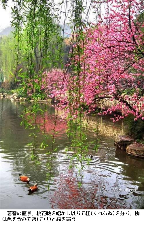 堤の柳は入り江に臨んで晴れの姿を美しくし、 桃源郷は海に通じて仙人の舟が浮かぶ。