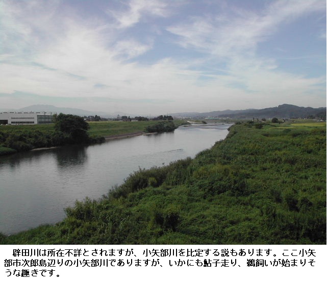 意訳:年が代わって春になると花々が咲きにおう。山のふもとを轟かして、激しく落下して流れくだる辟田(さきた)川。その川の瀬では鮎がすいすいと走る。鵜飼いの人々を伴って、篝火をかざして難渋しながら川を行くと、我が妻が形見と思って下さいと、紅色に幾度も染めて送ってくれた着物、その着物が水に濡れる