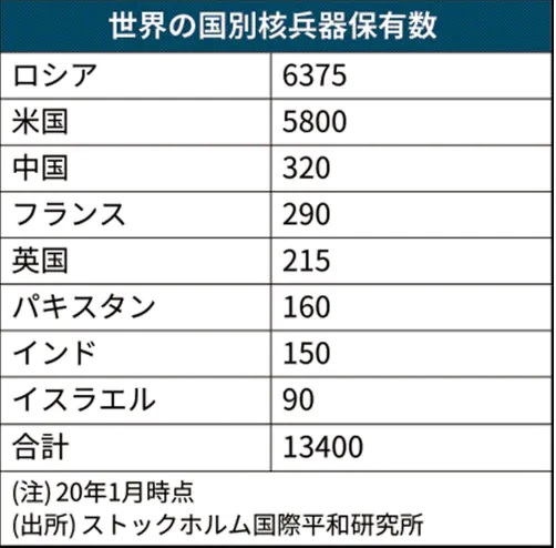 スウェーデンのストックホルム国際平和研究所(SIPRI)の推定によると、20年1月時点の核兵器保有数は約1万3千発と前年比で3%減ったものの、中国は前年より30発多い320発となった。インドも10~20発多い150発となり、北朝鮮も保有数を増やしたとみられる。